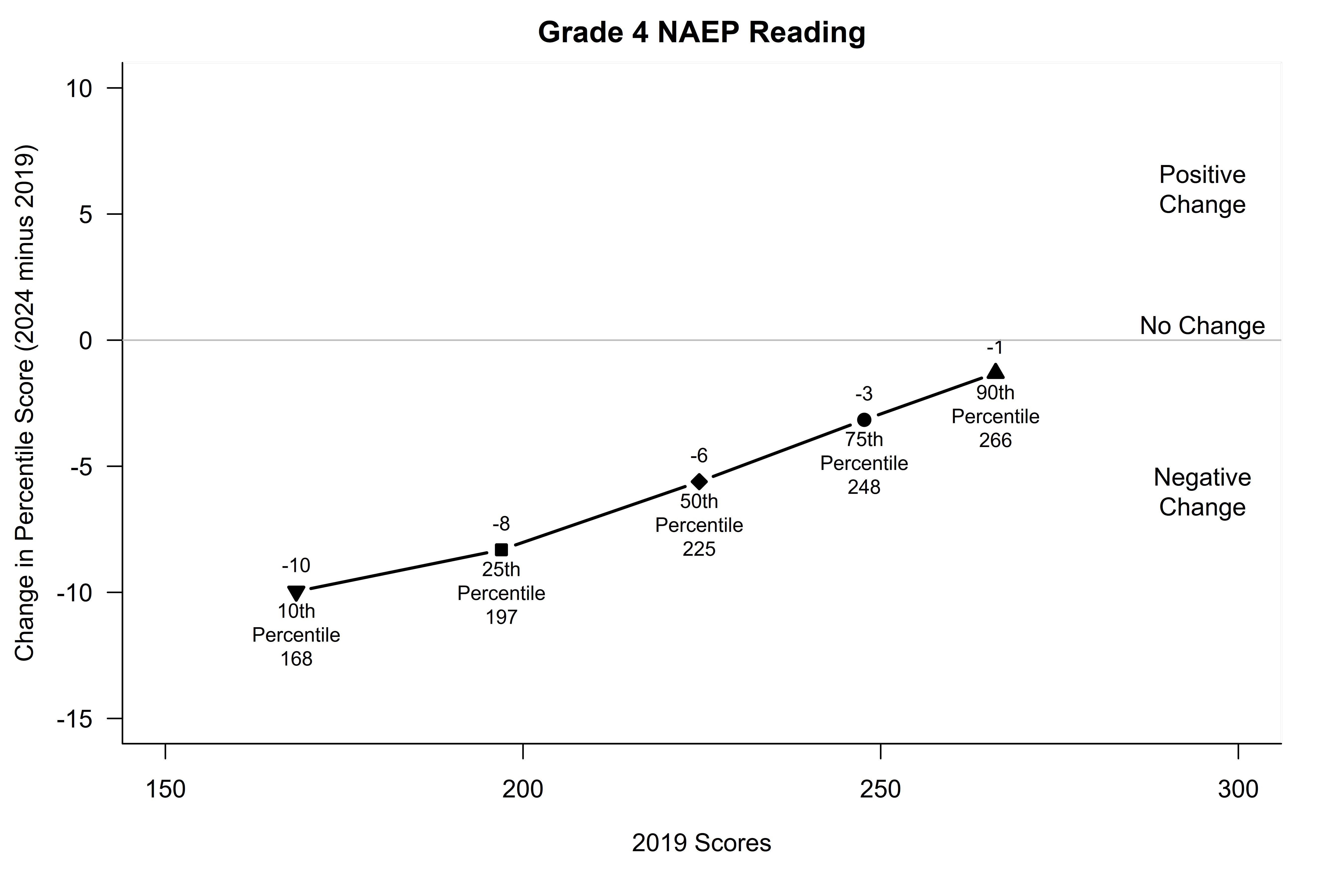 Figure 3. Changes in Grade 4 NAEP reading scores for the nation from 2019 to 2024. The horizontal line at 0 distinguishes between positive and negative changes.