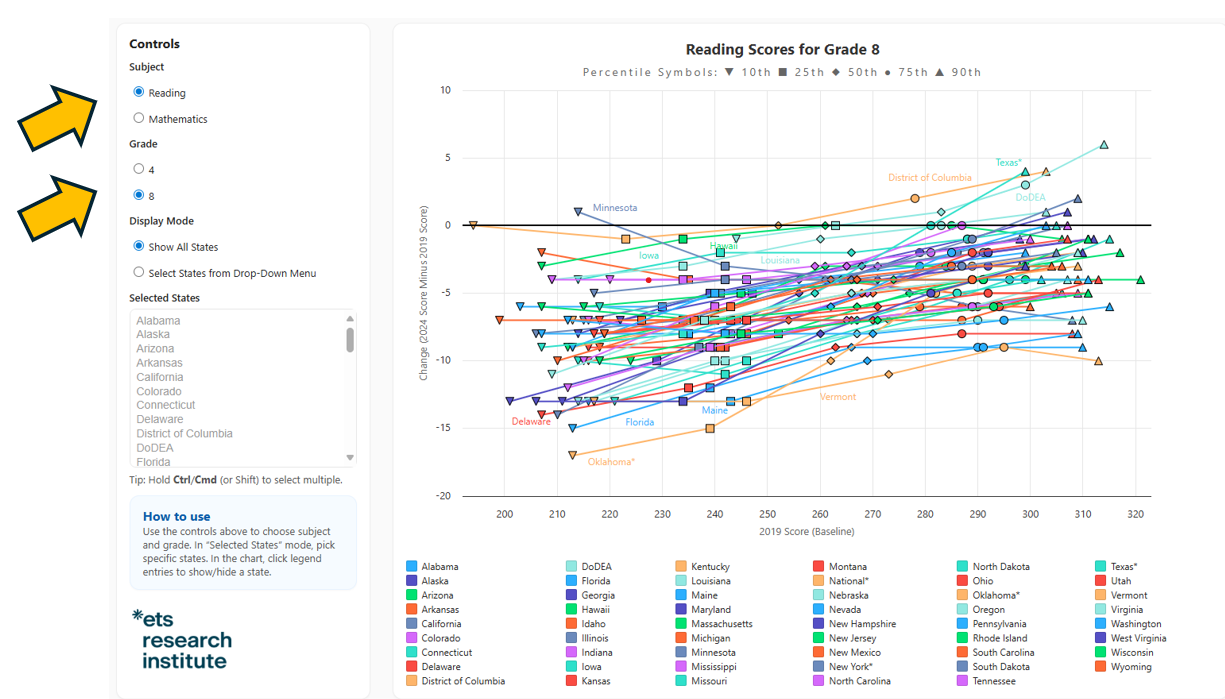- Use the left-hand “Controls” panel to toggle between reading or mathematics and Grade 4 or Grade 8 scores.
