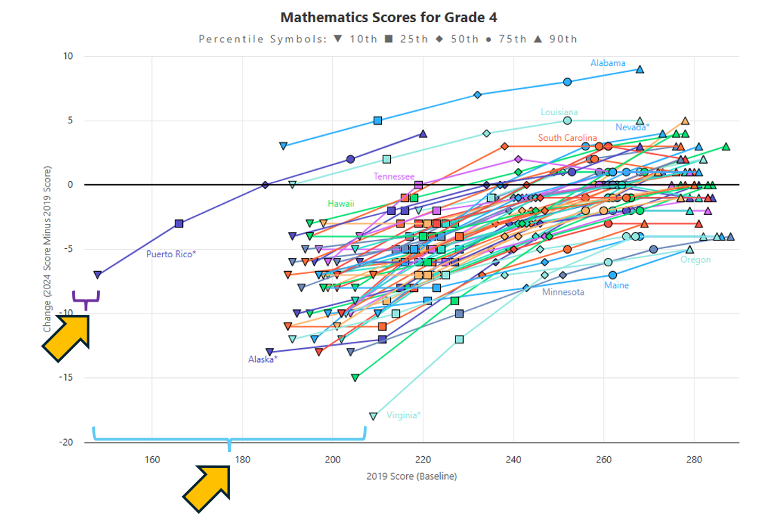 - However, the lines for Louisiana and Mississippi are much shallower or less steep, meaning that educational gains and losses were more similar between high and low performers. The line for Louisiana is above 0 and almost flat! This means that Louisiana was able to rebound scores to or beyond pre-pandemic levels for students across the achievement spectrum. Grade 4 students, regardless of academic need or level, are performing better in Louisiana in reading in 2024 than pre-pandemic in 2019! This result may reflect Louisiana’s reforms at work.